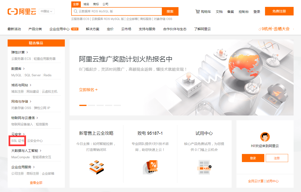 首先登陆阿里云官网:https://www.aliyun.com,找到SSL证书,点击以后会有选购证书和SSL证书控制台,咱们这里先点击选购证书。