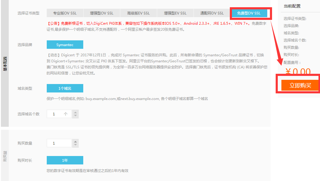 证书类型选择:免费型DV SSL(这是一个免费的HTTPS证书,基本上能满足中小型企业的需求),点击立即购买就能获得一个免费的HTTPS证书。